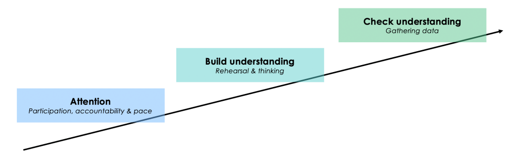 My strategy for explicit instruction involves asking questions in three phases. Phase 1 questions include firing out high-frequency ‘checks for listening’. These are simple questions all pupils are expected to answer (either through choral response or ‘all hands up cold calling‘) and serve to interrupt the loss of attention. Phase 2 questions involve lots of rehearsal and give pupils a chance to grapple with or generate new ideas. The goal is to build understanding to the point where it is secure. Phase 3 questions are ‘checks for understanding‘ and their responses give the teachers feedback about whether to move on to the next part of the explanation or not. (In the linked clip, I use the data I gather from a Phase 3 question to decide that more rehearsal is needed, and so use a Phase 2 question in the form of a ‘turn and talk’.)